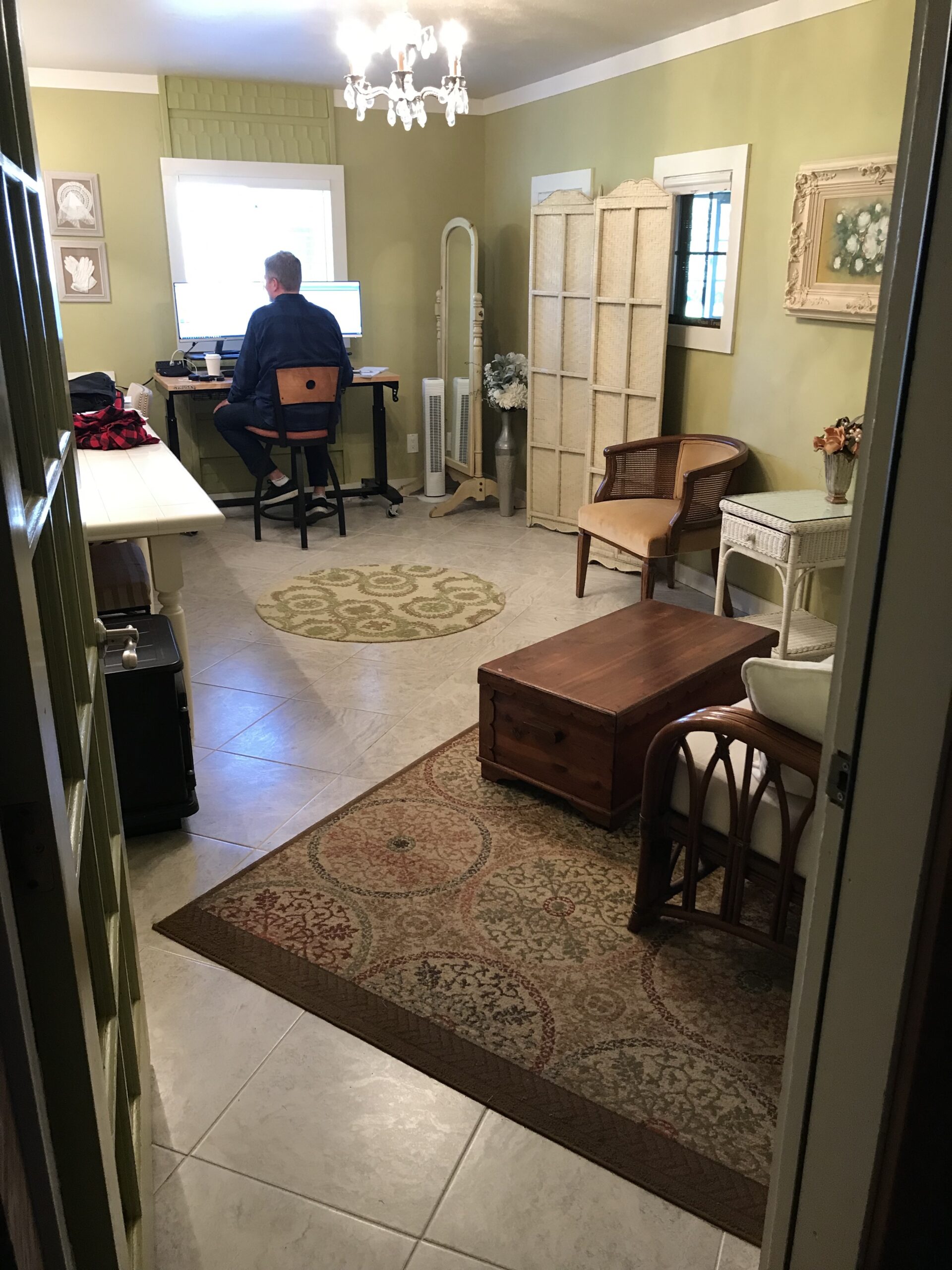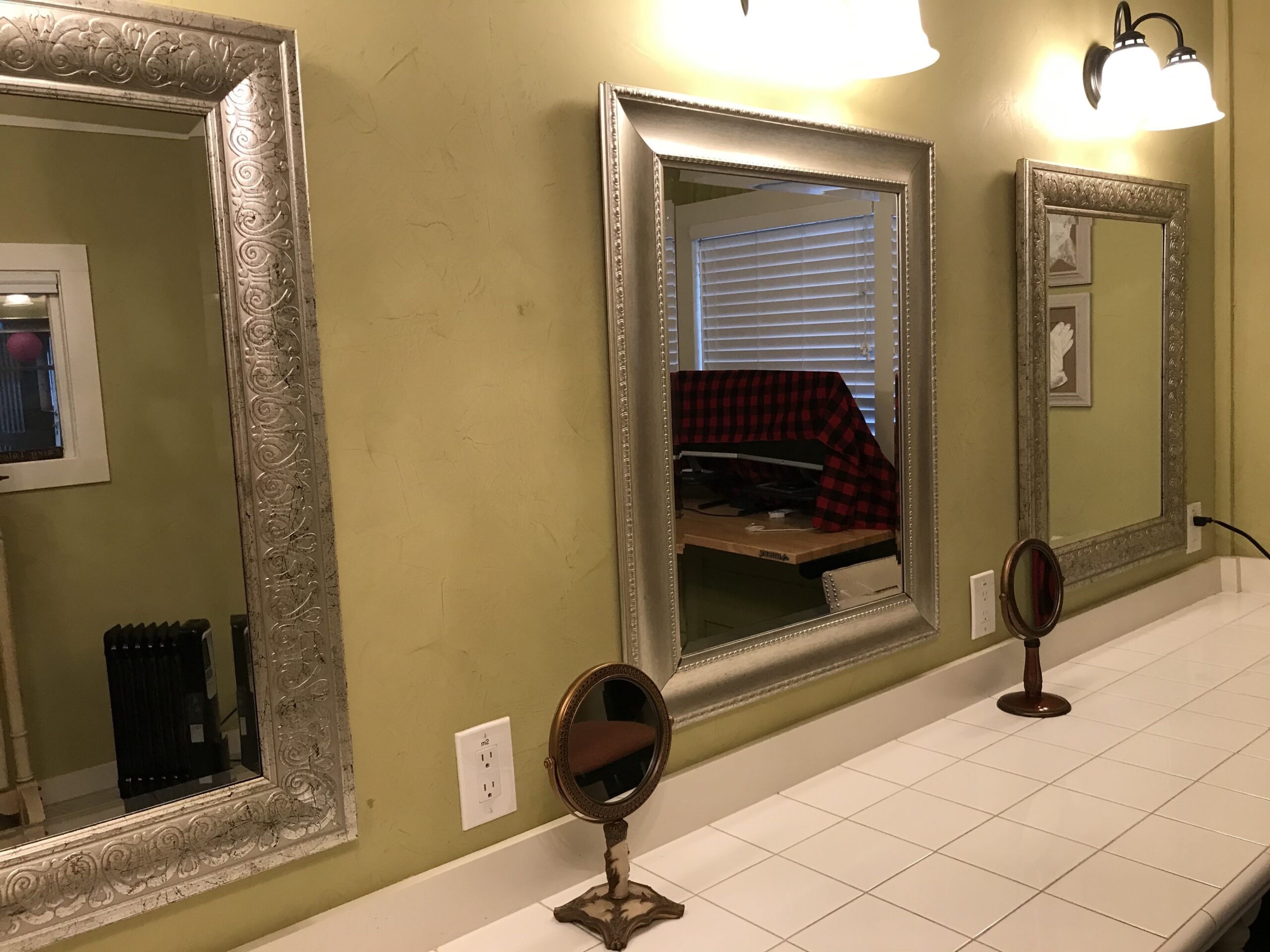 In 2020, we completely gutted the room and recreated the space. We started by repainting the green walls with a neutral cream.  We heard from makeup artists and photographers alike that soft and neutral is best!. We also removed the old floor tile and replaced it with a warm wood tone flooring.