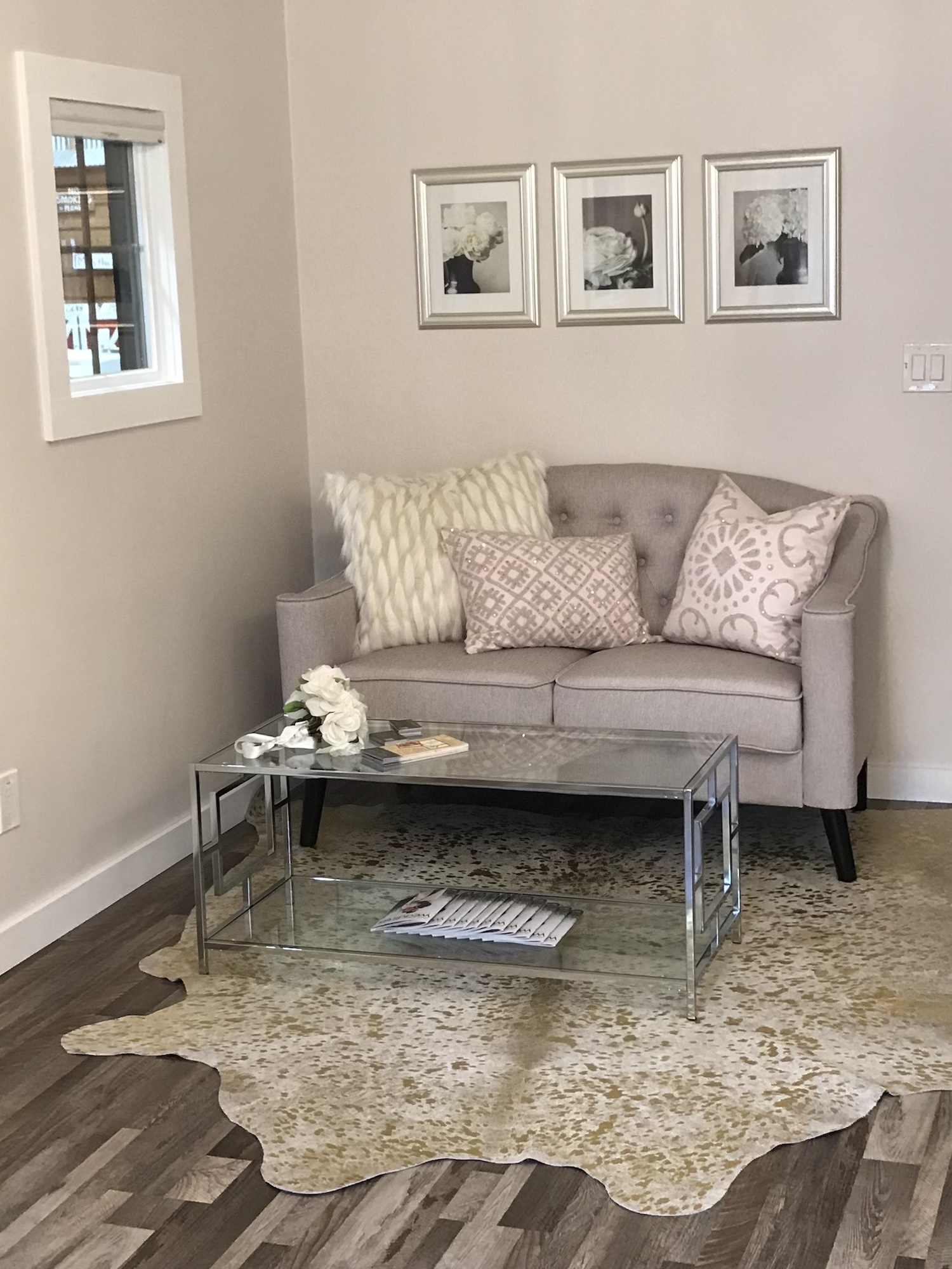 The bride’s room did have a built-in countertop, but it was tiled and the grout needed some attention so we decided to give it a refresh. We removed the counter entirely, eliminating the wooden post legs, and replaced it with a floating custom quartz slab countertop that we then paired with new padded stools for a more lux look. A new sofa, side chairs and coffee tables were also added to move away from farm chic into a more feminine and elegant aesthetic.